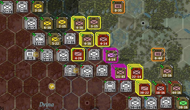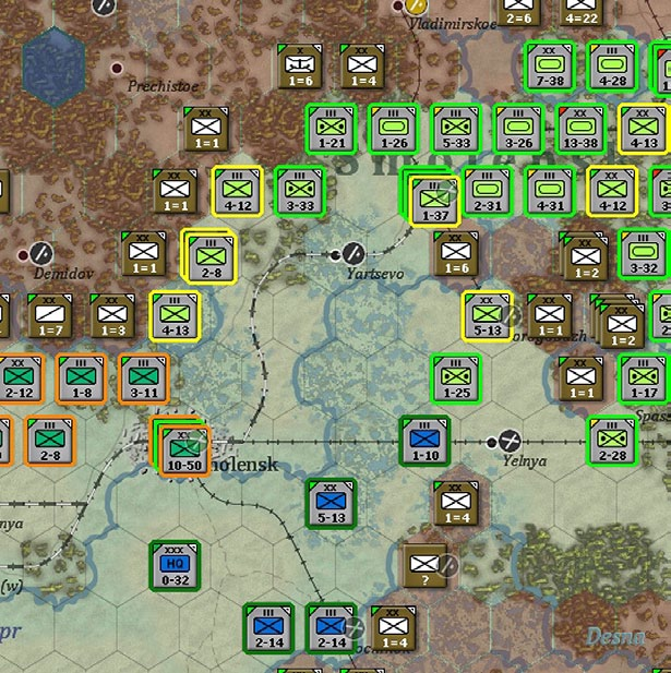 Here, units of 2 separate Soviet armies have been selected (so two army commands are highlighted in orange). However, all the combat units in the two armies are shown in yellow as all they have in common one or the other shared HQ.