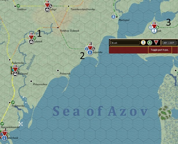 In this instance, the bulk of the Soviet depots are based on rail yards (1), Osipenko is set to receive freight (2) and Eysk to send freight (3). Note that if you click on a port hex you can toggle it between receiving and sending use the top of the game screen (shown as an inset). Depot supply priority levels (25.7) are indicated by a color coded number in the middle of the depot symbol with bright green=4, dark green=3, yellow=2, orange=1, and red=0).