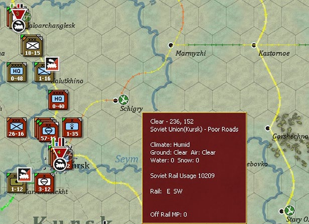 Here the Soviet rail net around Kursk is heavily used due to a build up of forces. Most of the rail lines are shown as yellow, a few are orange (reflecting the extra supply demands of the large air base at Schigry. The map pop up shows the usage of a particular hex.