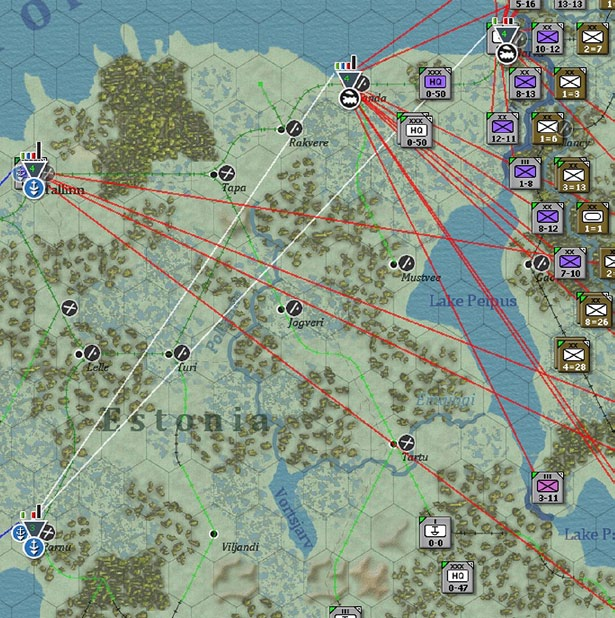 Talinin cannot send to another depot (a priority 4 depot cannot supply another depot) but is supplying a number of Axis combat formations (the red lines). These concepts are covered in section 25.7 in more detail.